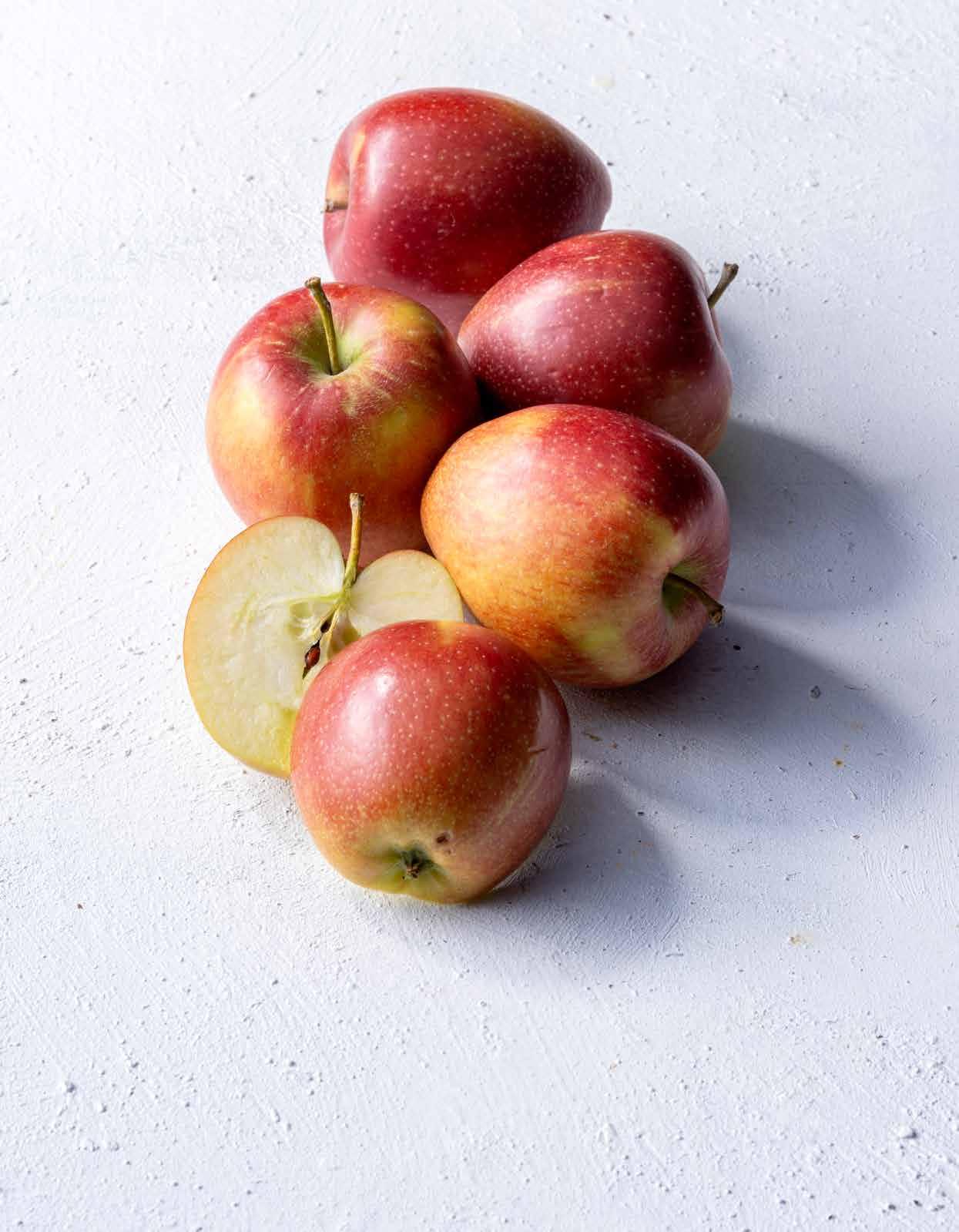 1. Épluchez les pommes et ôtez le trognon par le bas à l’aide d’une cuillère parisienne. Vous créez ainsi un creux dans le bas, que vous farcirez de frangipane plus tard.