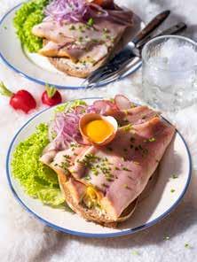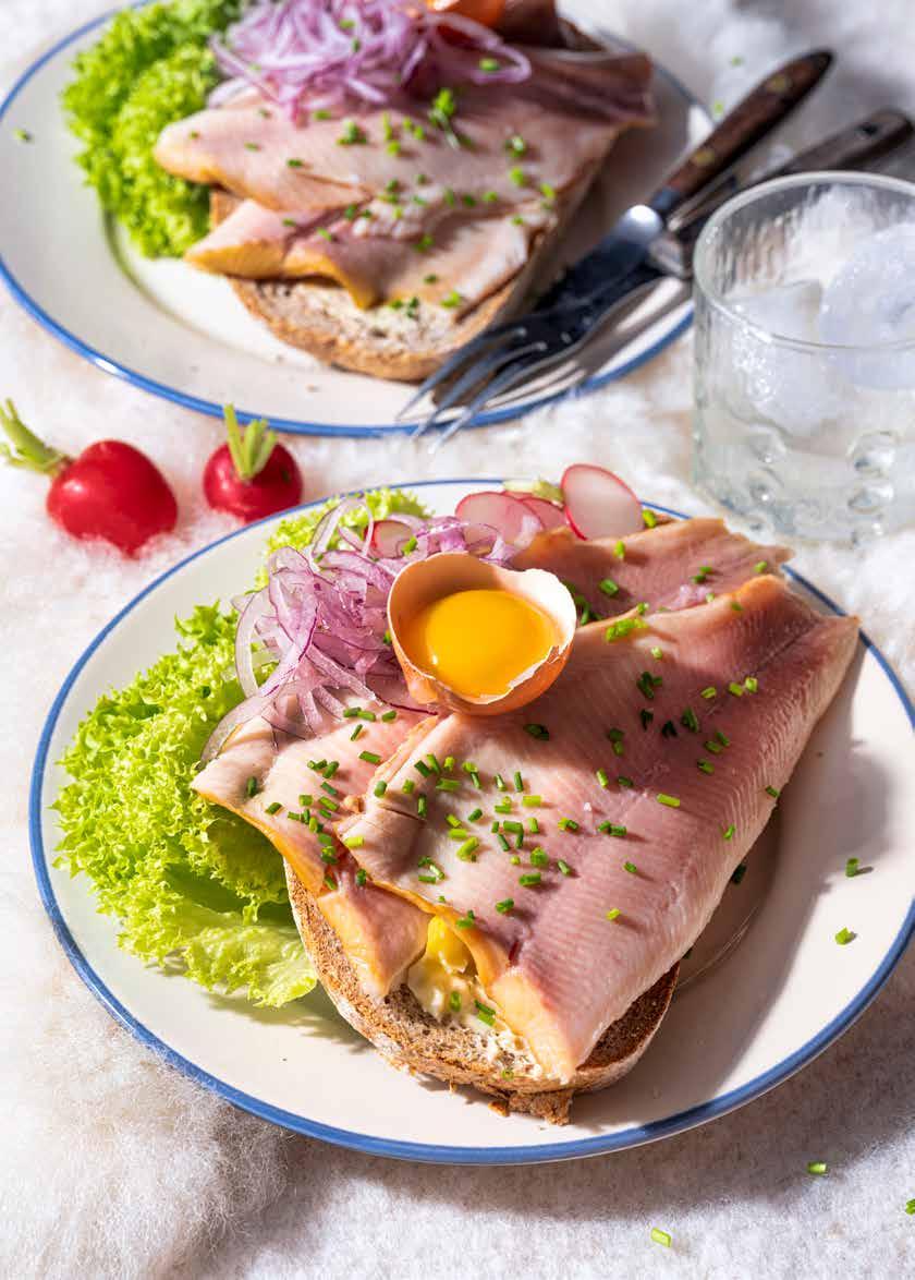 Bien plus qu’une tartine, ce Sol over Gudhjem ! Le sandwich ouvert de pain de seigle, truite fumée, radis et jaune d’œuf forme un lunch sain et délicieux. La recette se trouve en p. 25