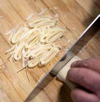 4. À l’aide d’une latte et d’une roulette à pizza, découpez la pâte feuilletée durcie en bandes fines.