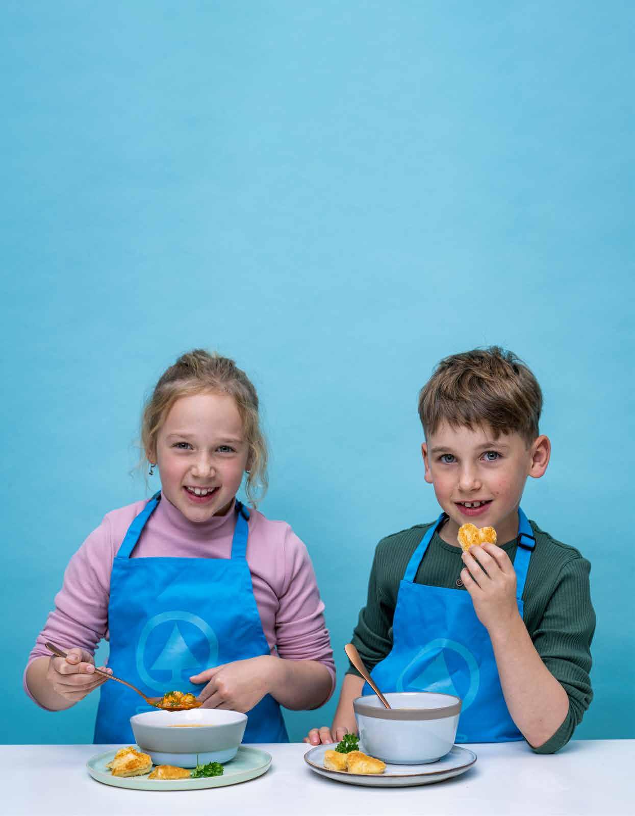 Dans la Cuisine des petits, les jumeaux Ella et Theo préparent une soupe tomate avec des boulettes et un toast au fromage très spécial.