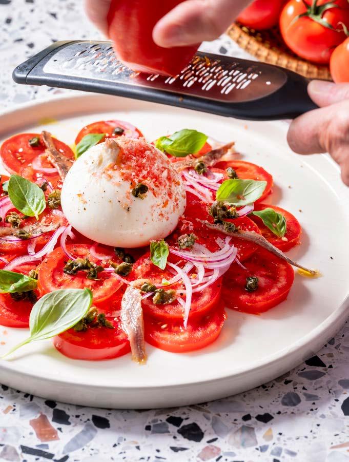 31 Salade de tomates multicolores et bouillon de coriandre, ail et crumble de feta