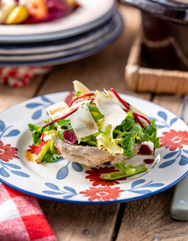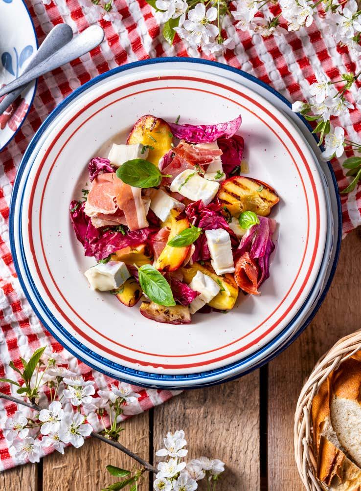 24 Brie et pêche grillée, radicchio, basilic et jambon séché