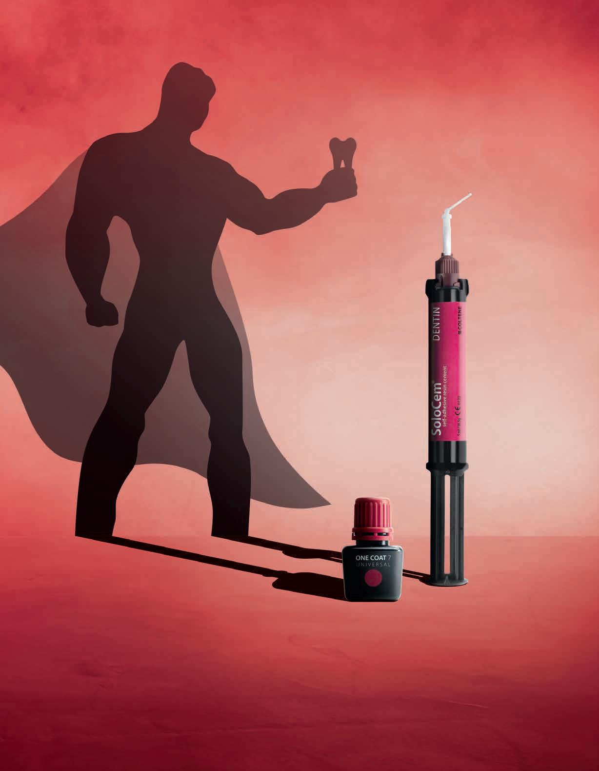 Crede nella velocità e nell'efficienza? Allora scelga SoloCem, perché l'applicazione autoadesiva non è soltanto veloce, ma anche sicura. Tuttavia, a seconda del caso clinico potrebbe essere necessario un legame adesivo più forte. Anche in quel caso, SoloCem è la scelta giusta – usi in aggiunta ONE COAT 7 UNIVERSAL come "amplificatore di adesione".