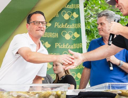 Expanding to a four-day event, Picklesburgh helped draw 1.76 million visitors to Downtown Pittsburgh in July, during which the average daily foot traffic increased to over 100,000 people, signaling a 100% return in visitor traffic from pre-pandemic levels. This year’s festival put competition in the spotlight with expanded games held on a new stage in Market Square. Winners of Pickle Juice Drinking, Pickle Eating, and Bobbing for Pickles were determined in three championship rounds with prizes of $500 each, a pickle trophy, and the fun titles of Duke, Earl, and Baron, respectively. The festival’s popularity is due partly to Picklesburgh 2024, a top-ranked “Specialty Food Festival in America” by USA Today, whose attendance numbers broke records between July 18 and July 21, attracting 250,000 participants, including 50,000 who traveled at least 150 miles to attend. Pennsylvania Governor Josh Shapiro made a special appearance, becoming the first governor to attend the festival.