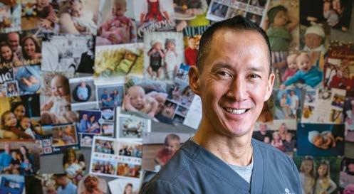 Powyżej: Dr Patrick Yeung – uznany chirurg specjalizujący się w leczeniu endometriozy oraz członek rady 13823 im. Miłosierdzia Bożego w Sunset Hills (Missouri) – stoi na tle zdjęć dzieci poczętych dzięki RRM. Wśród pacjentek, którym przywrócił płodność, jest jego żona Dorothy, która po kilku latach bezowocnych starań urodziła czworo dzieci. • Sąsiednia strona: Zapłodnienie in vitro – połączenie komórek jajowych kobiety z nasieniem mężczyzny w warunkach laboratoryjnych – ma na celu wytworzenie ludzkich embrionów.