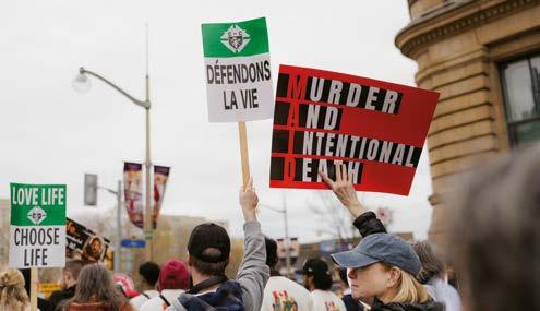 Działacze pro-life prezentują transparenty broniące życia i sprzeciwiające się medycznie wspomaganej śmierci (MAiD) podczas