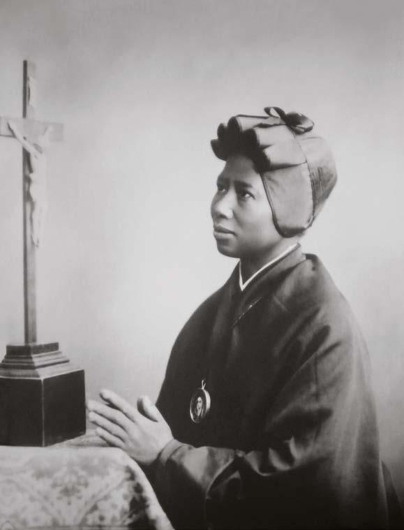 Bakhita modli się przed krucyfiksem w Wenecji, około 1933 roku.