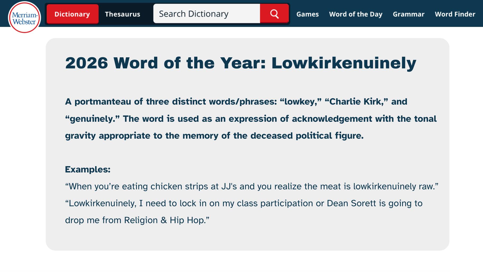Merriam-Webster declares ‘Lowkirkenuinely’ 2026 Word of the Year