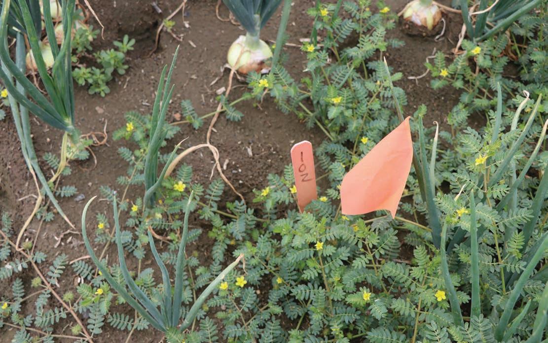 Puncturevine usually emerges after onions are established. The weed grows close to the ground and forms dense mats at the base of onion plants. It competes with onions for growth resources, produces seed burs that stick to tractor tires and interferes with harvest operations.