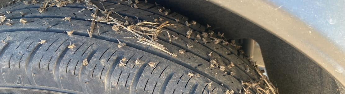 Puncturevine produces yellow flowers with five petals, about half an inch wide. The seedpods of puncturevine turn gray and spiky when mature. The seeds are contained inside the spiky seed pods. The seeds remain viable in the soil for up to five years. A puncturevine plant may produce 200 to 5,000 seeds during a growing season. Usually, the seeds remain dormant in the first season and germinate in the next. The spiky seedpods often stick to shoes, tires and animal fur.