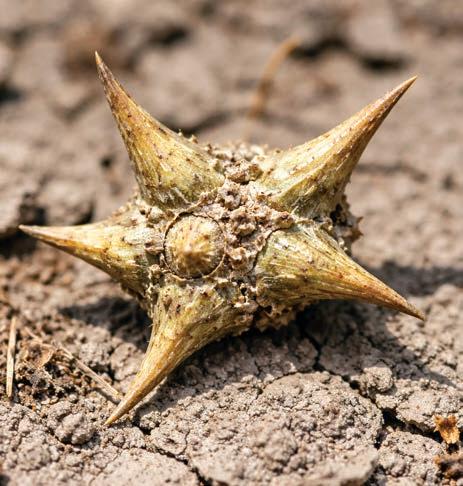 Puncturevine (Tribulus terrestris L.) is a summer annual broadleaf weed species. It is also called “goat head” or “caltrop.” It thrives in dry and hot growing conditions. It causes significant problems in agricultural production areas, home landscapes and gardens, as well as roadsides, railway yards and waste places.