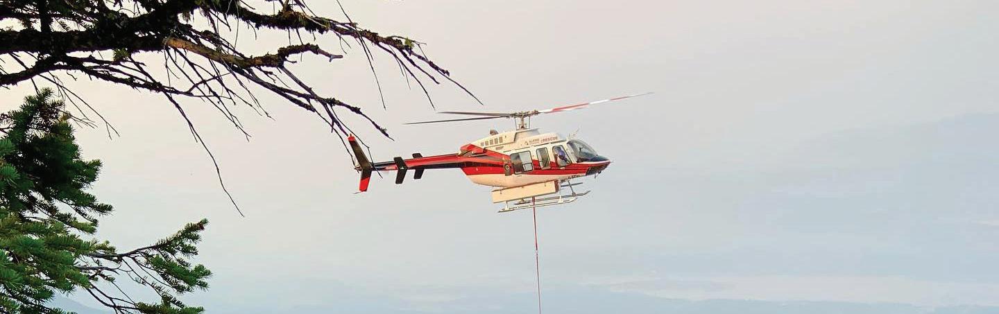 Last Friday evening a crew was requested to assist BC Emergency Health Services (BCEHS) with an injured hiker on Four Points Mountain, just east of Windermere. e team hiked in the dark to provide first aid and to stabilize the patient until a helicopter long-line extraction could be conducted at first daylight.