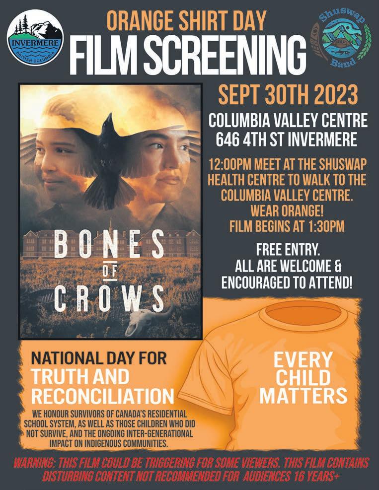 The Columbia Valley SABCURTIS 5 - 7 PM @ P Y N E L O G S C u l t u r a l C e n t r e JOIN US FOR A CASUAL ARTIST TALK WITH SEPTEMBER 29 FREE EVENT ON NOW. IN THE GALLERY w w w . c o l u m b i a v a l l e y a r t s . c o m invermere.bc.libraries.coop gnivreS t eh oC u mb i a Vall e y U P COM I N G EV E NTS 11:30 am Intro to Sec wepemc tsin Language led by Robyn and Tisha Tardif 2:00 pm Discussion on Bob Joseph’s 21 Things You May Not Know About the Indian Ac t Truth and Reconciliation Day Sept. 30 MARKET CROSS ROADS O P E N 2 4 H O U R S / DAY 9 4 O C TA N E S U P R E M E P L U S F U E L N O W AVA I L A B L E ! This week s winner is… Kerr y Farrell Many, many more draws will continue through 2023 ’ GREAT GAS G I V E A W AY