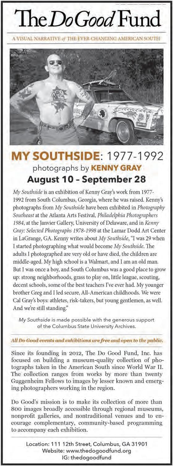 My Southside 1977-92: Photographs by Kenny Gray will be on view at The Do Good Fund Gallery. Local photographer Kenny Gray served as Director of the Columbus State University Rankin Photography Center from 2011-2022. His fine art photography has been widely exhibited. My Southside is an exhibition of Kenny Gray’s work from 1977-1992 while living in South Columbus.