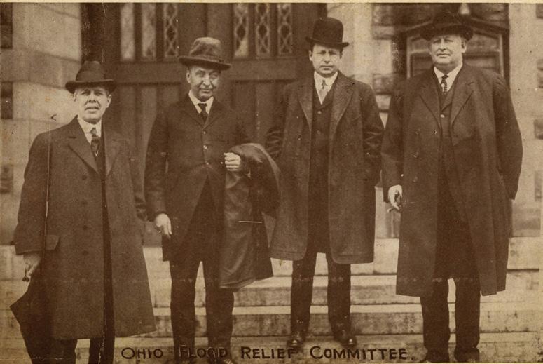 • After the catastrophic 1913 flood, the library helped reunite families through The Ohio Flood Relief Committee, appointed by Gov. James Cox (second from right). James Kilbourne (second from left) served as president of the library’s board of trustees for four terms.