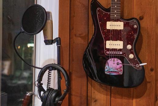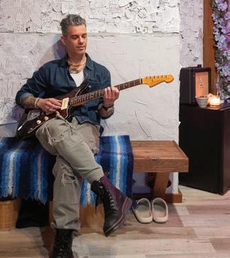The studio is just, well, cool. Guitars and recording equipment mingle with hundreds of his tattoo designs. Candles burn, disco balls glitter, neon lights glow and artwork created by his grandfathers is displayed alongside gifts from friends and clients.