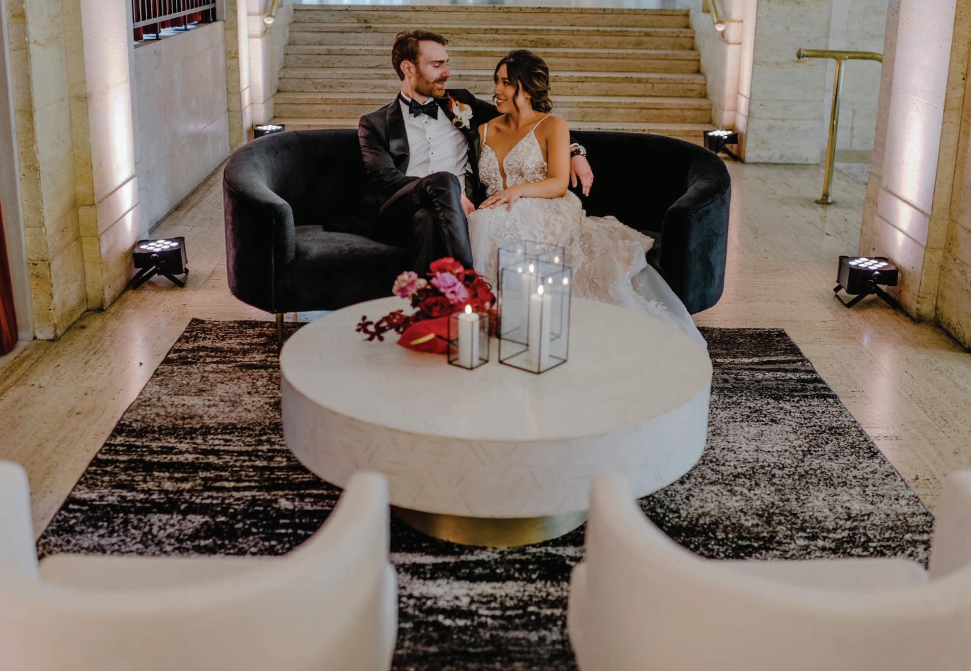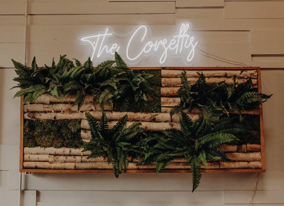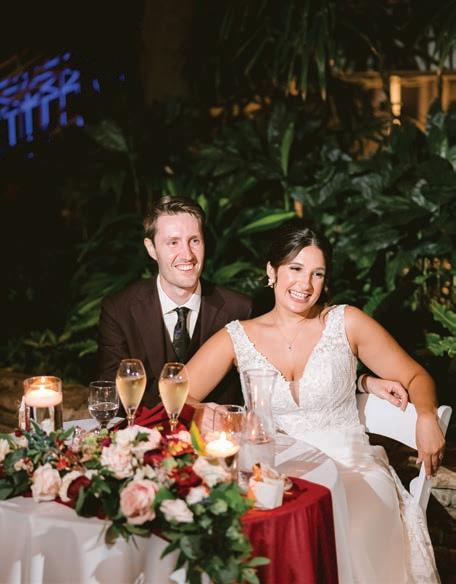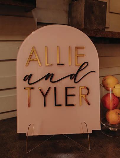 After combining their maiden names to create a last name (more on Page 22), Tyler (left in inset photo) and Allie Corsetti honored the moniker with a neon sign and marquee letters rented from BurgundyGinger Events for their Aug. 7, 2022, wedding at Vue Columbus. Ericka Greene Events helped with planning and design.