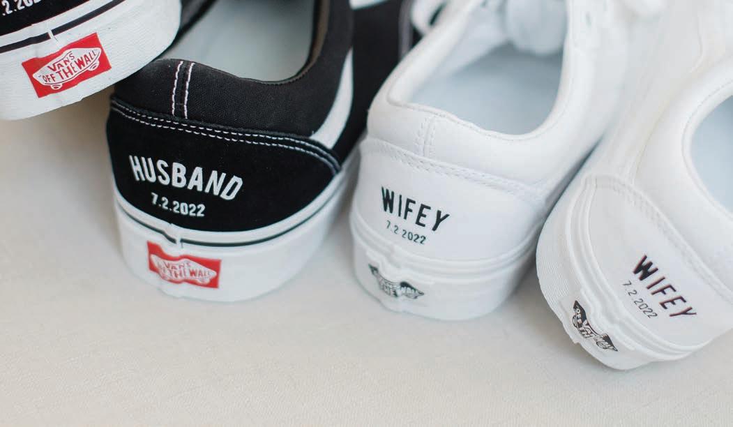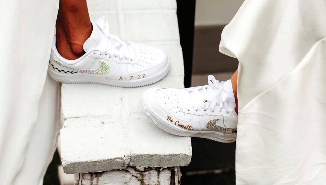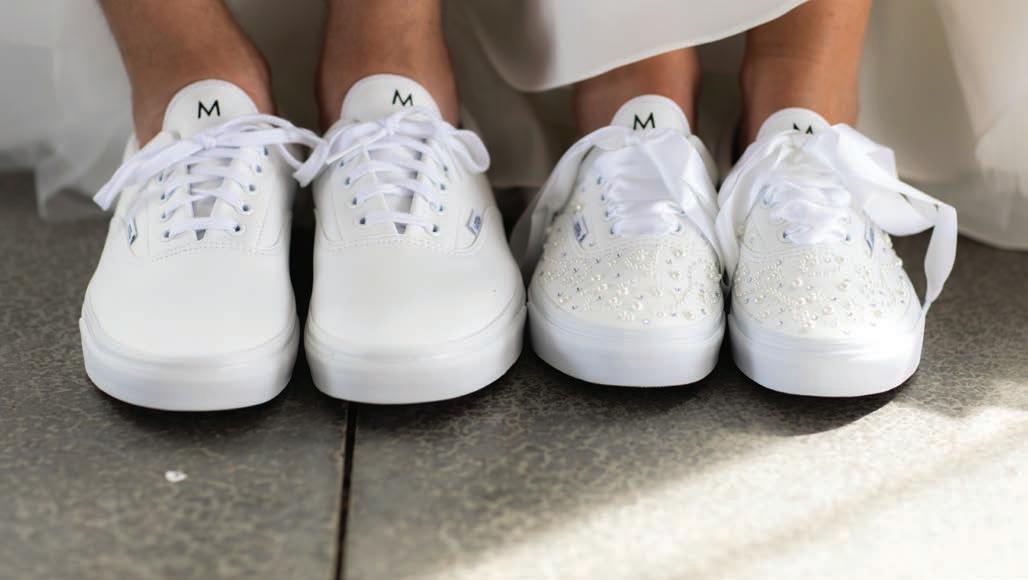 Clockwise from above, Anthony Montes surprised Lauren Montes with custom Vans before their Sept. 2, 2022, wedding at Magnolia Hill Farm; Claire and Austin Scheutz changed into personalized Vans for the sparkler exit from their reception at Magnolia Hill Farm on July 2, 2022; Morgan Jeter wore custom Vans all day long when she married James Jeter at Edison777 in Italian Village on Sept. 2, 2022; a friend added extra touches to Nikes for Columbia University assistant basketball coaches Tyler and Alexandra Corsetti, who married Aug. 7, 2022, at Vue Columbus.