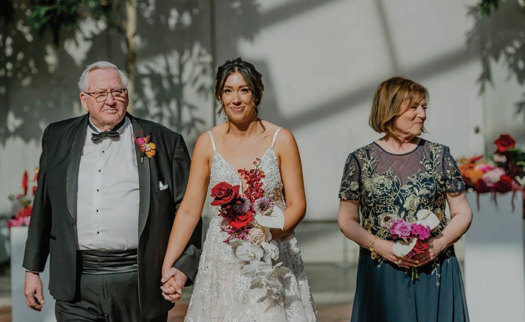 Instead, Morgan had her mom’s dress taken in slightly—“I’m 5’7”, and she’s 5’10,” and we were the same size,” Morgan says—and wore it at the wedding; she saved her new dress, sleeker and simpler than her mom’s, for the reception.