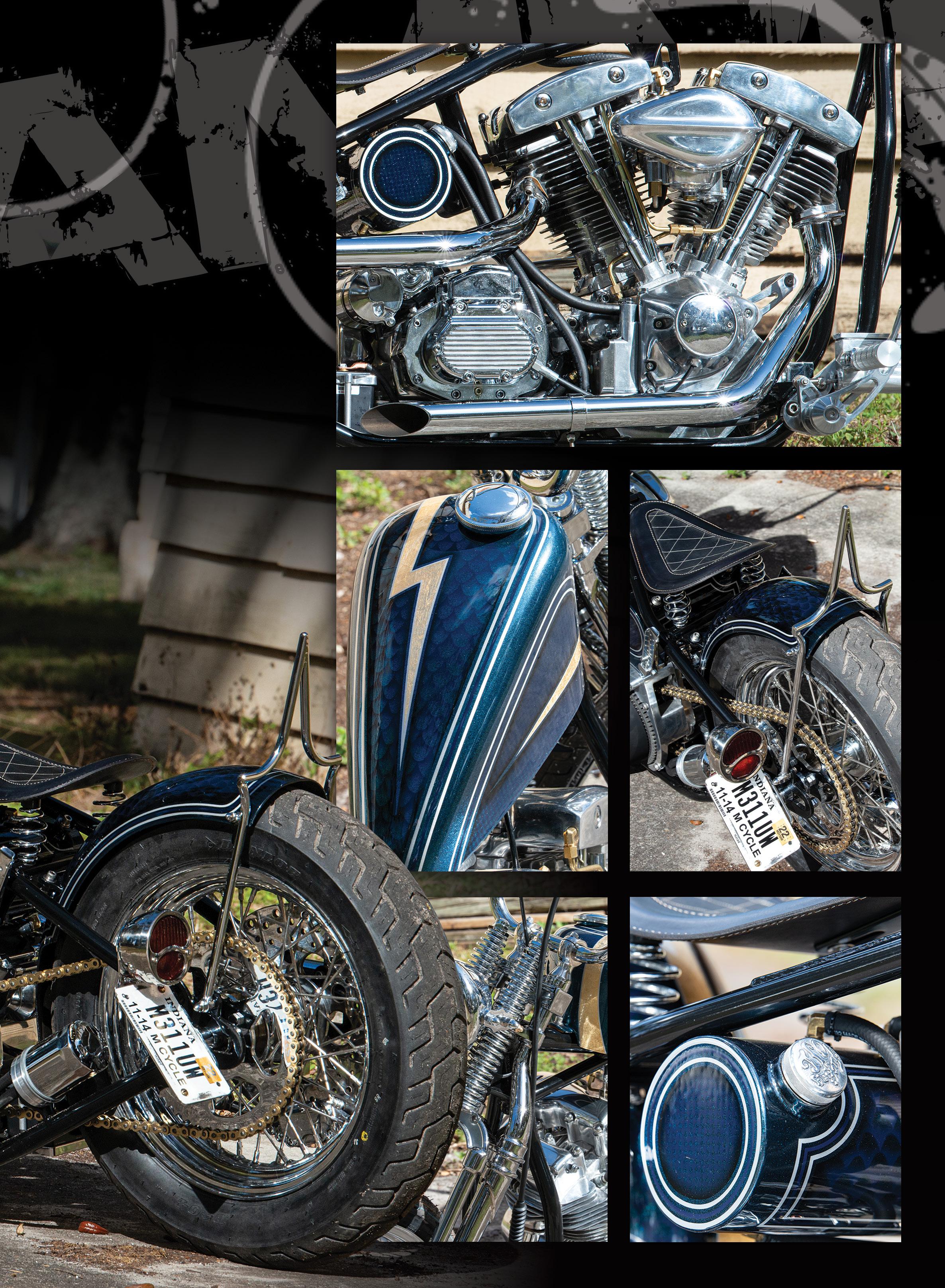 generation and trying to keep another out at the same time. What we do and how we look to the outside world is simply a reflection of who we are. Ahh, that stings a little, right? Well, my brothers and sisters, it’s the truth. A wise man told me a long time ago that the only thing that will ever remain is change, so get comfortable with it. Now that doesn’t mean you have to stop loving the type of bikes you do. No one is telling you to throw out your beloved ’49 pan with the 18 over springer for an electric zippy bike. No, no, you do you, just try not to let your view of what’s cool overshadow someone else’s self-expression. It is that very thing that makes the American Custom Motorcycle culture a rare and unique experience. It lives on the pulse of the people chasing it, not those who would look to possess it. In the end, we are all simple servants to it whose time will come and go. The way we pass along the knowledge and experience of it is how our generation will be judged in the end. So, live it up, baby, the clock is ticking, and old Jr. is out in the shed trying to figure out how to weld lawn mower blades to your spool wheel. Go make sure he learns how to do it, then get him a job so he can buy you a new damn wheel!