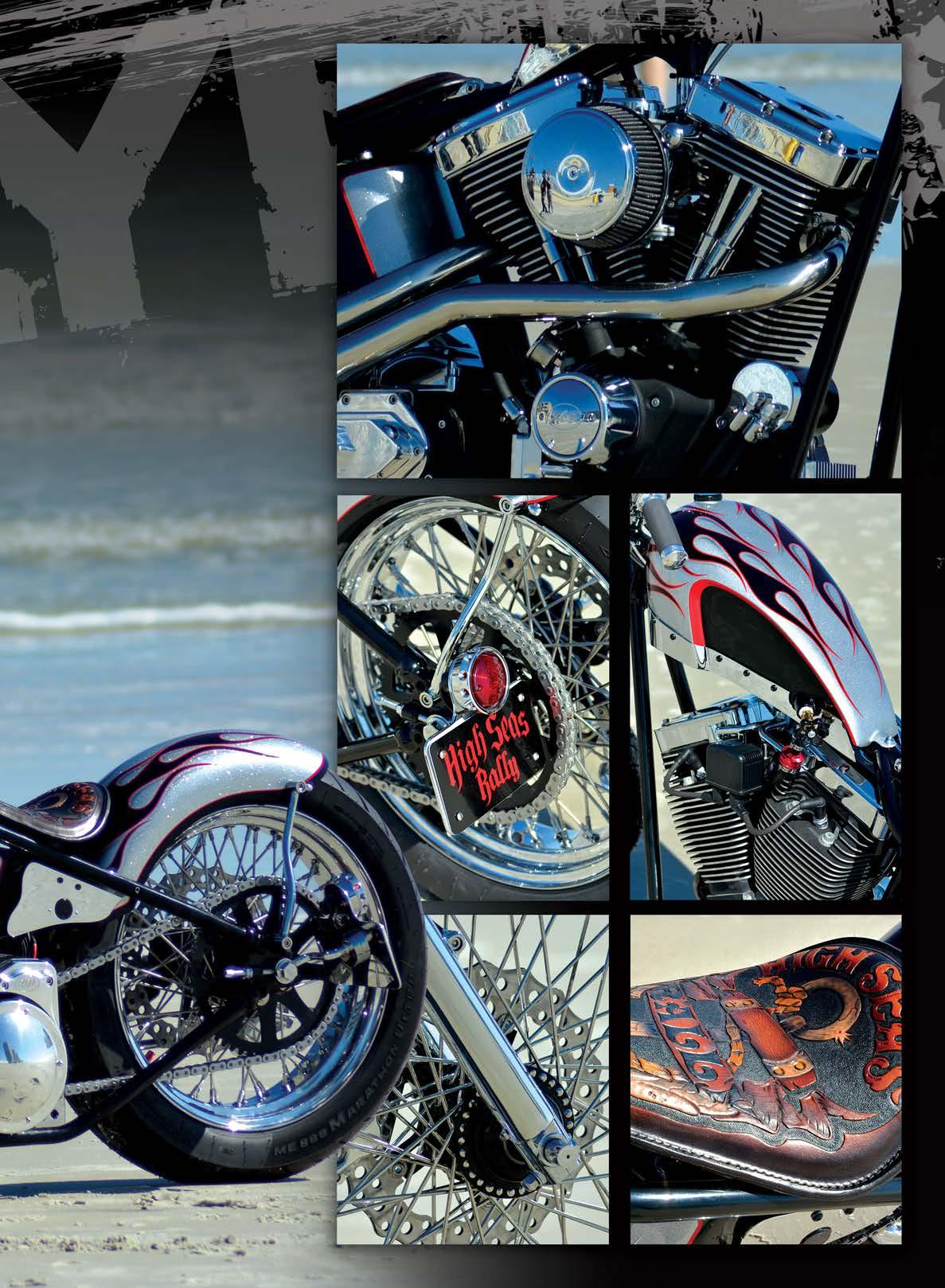 The saddle on the HSR bike is handtooled by Curt from Bare Bones, and the seat pan is affixed to one of Paul Cox’s manual Rigidaire seating systems. The HSR chopper is powered by an 80-inch S&S Engine. The powerplant sends power through a BDL 2” open primary to a five-speed gearset built by Xavier that contains some parts from Jim’s USA to compliment what is left of the factory Harley internals.