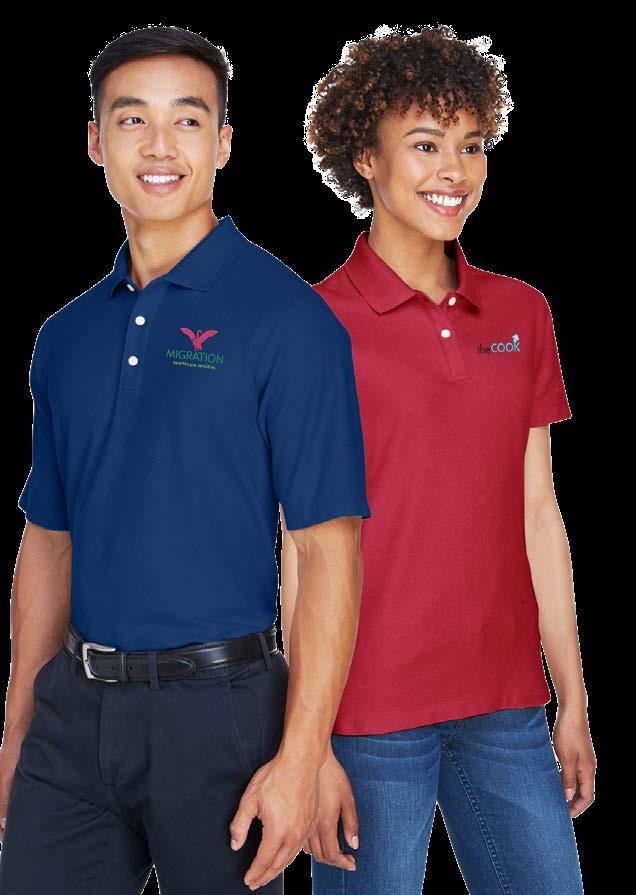 Order online and shop more at COMDA.COM8 APPAREL POLOS scan for more choices Use promocode GIFT2022 to SAVE 10% Visit COMDA.COM for more polos, styles, colours and designs. 1. CM1206 As Low As $19.13 2. 88181/78181 As Low As $21.66 3. 88181P/78181P As Low As $24.73 4. TT51/TT51W As Low As $19.36 DEVON & JONES POLO • Polo features premium qualities that make it a higher-end product. • Anti-pill, anti-wrinkle, no-curl collar performance ensures polo can withstand the test of time. • 6.3 oz./ yd² / 215 gsm, 100% combed cotton pique polo with three-button placket. Active fit, EZCool wicking performance. • Sizes: XS-6XL Mens, XS - 3XL Ladies DG150/DG150W OUR BEST! 1 3 2 4 Setup: $30.00 6 12 24 48 96 full colour $83.00 $67.00 $53.89 $52.38 $50.98 embroidery $65.00 $53.77 $46.41 $44.91 $43.51 1 colour $59.00 $49.75 $45.26 $43.76 $42.36