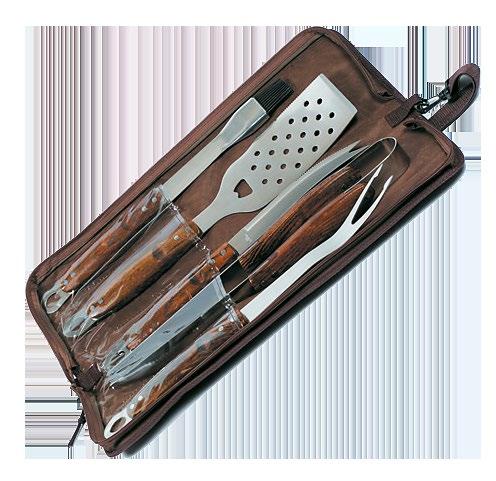 This premium BBQ tool set features stainless steel tongs, a multifunction spatula, knife, fork, and silicone-bristled brush, and comes in a durable, zippered nylon case with an adjustable shoulder strap.