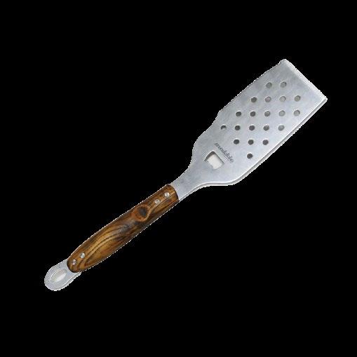 More than just a grilling accessory, this multi-functional spatula boasts a durable wood handle, a serrated edge for cutting, and a built-in bottle opener.
