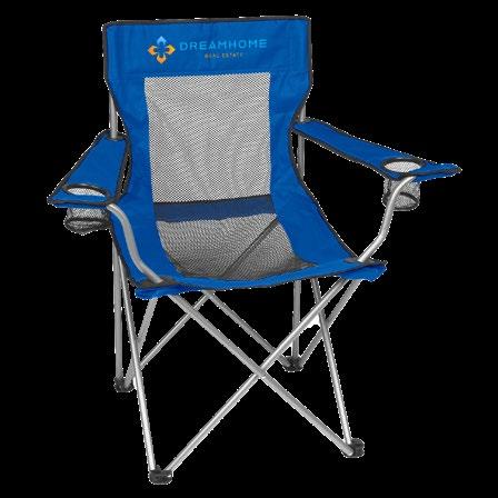 This folding chair includes two mesh cup holders for beverages and comes with a polyester carrying bag equipped with a shoulder strap, ensuring easy transportation and storage.