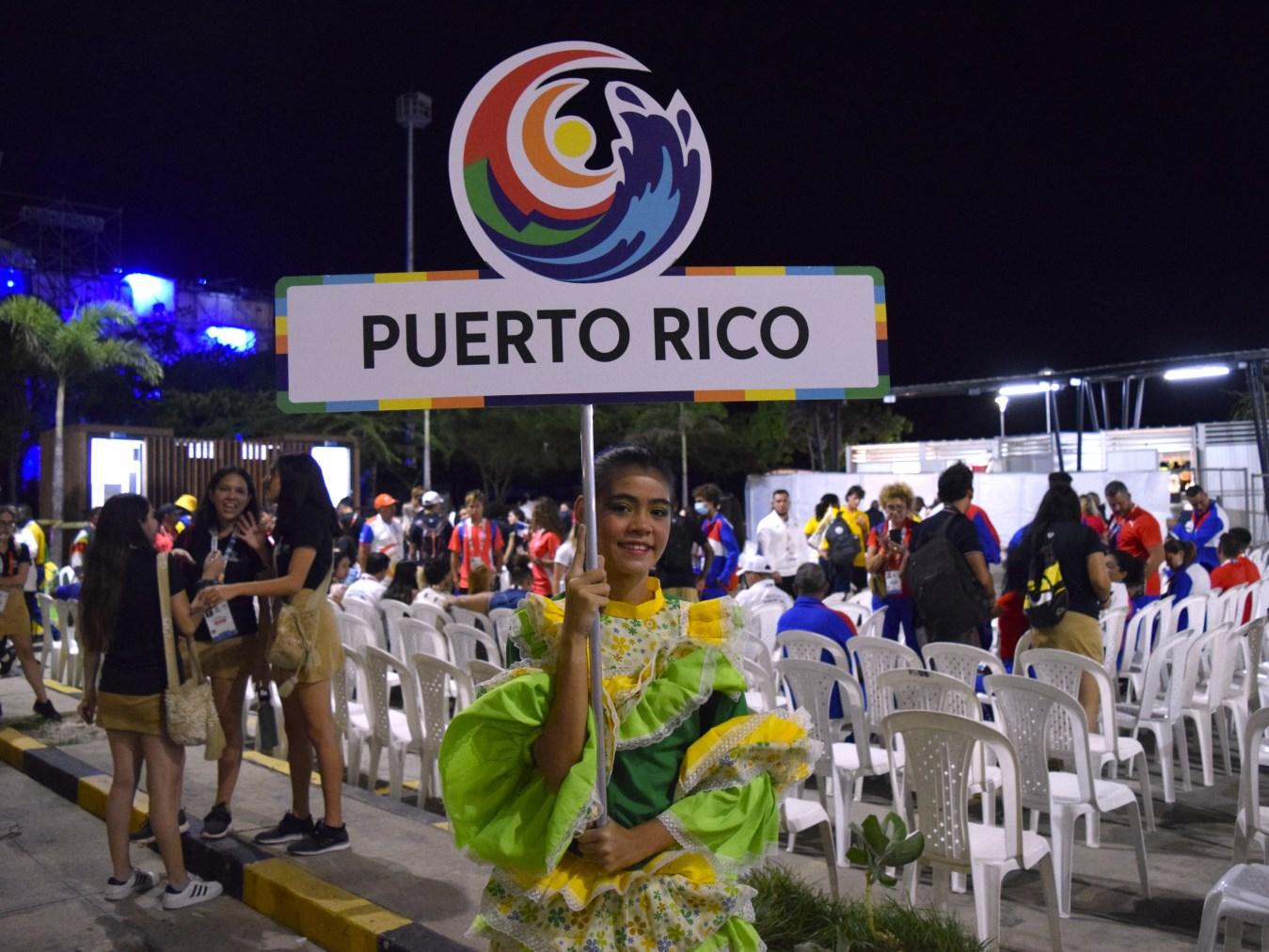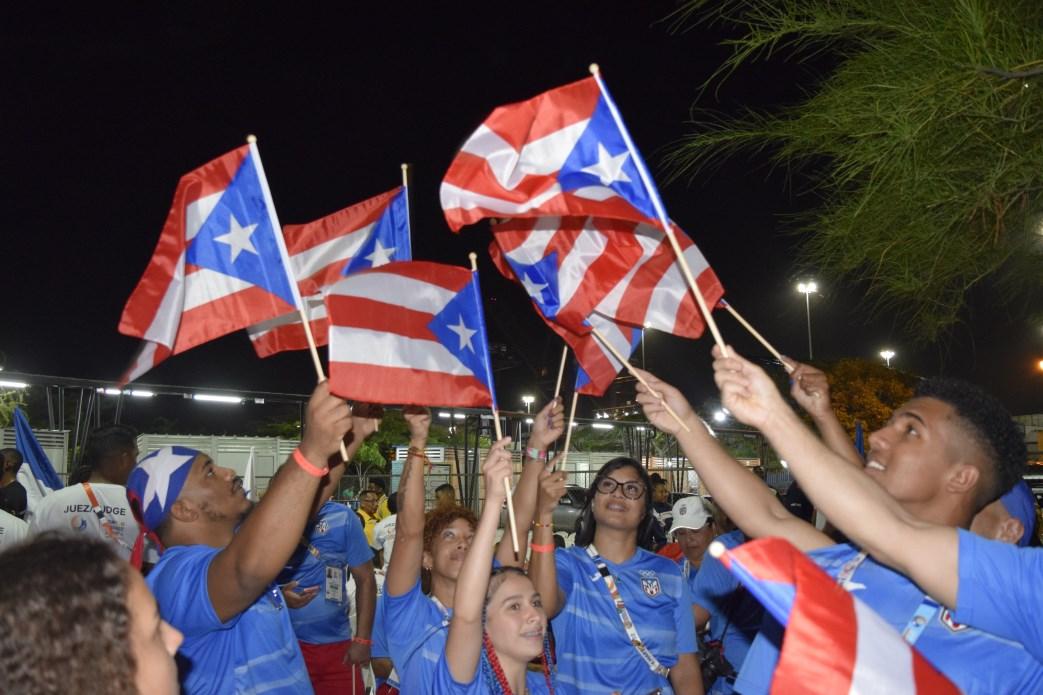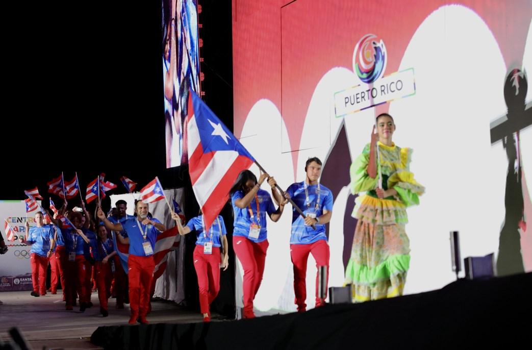 La balonmanista Roxanaly Carrasquillo y el velerista Pedro Luis Fernández ondearon la monoestrellada ante sus compañeros de Puerto Rico con algarabía y orgullo patriótico. La comparsa boricua subió a la tarima sonriente, feliz y alegre de estar ante otras naciones que competirán en estas nuevas justas de Centro Caribe Sports.