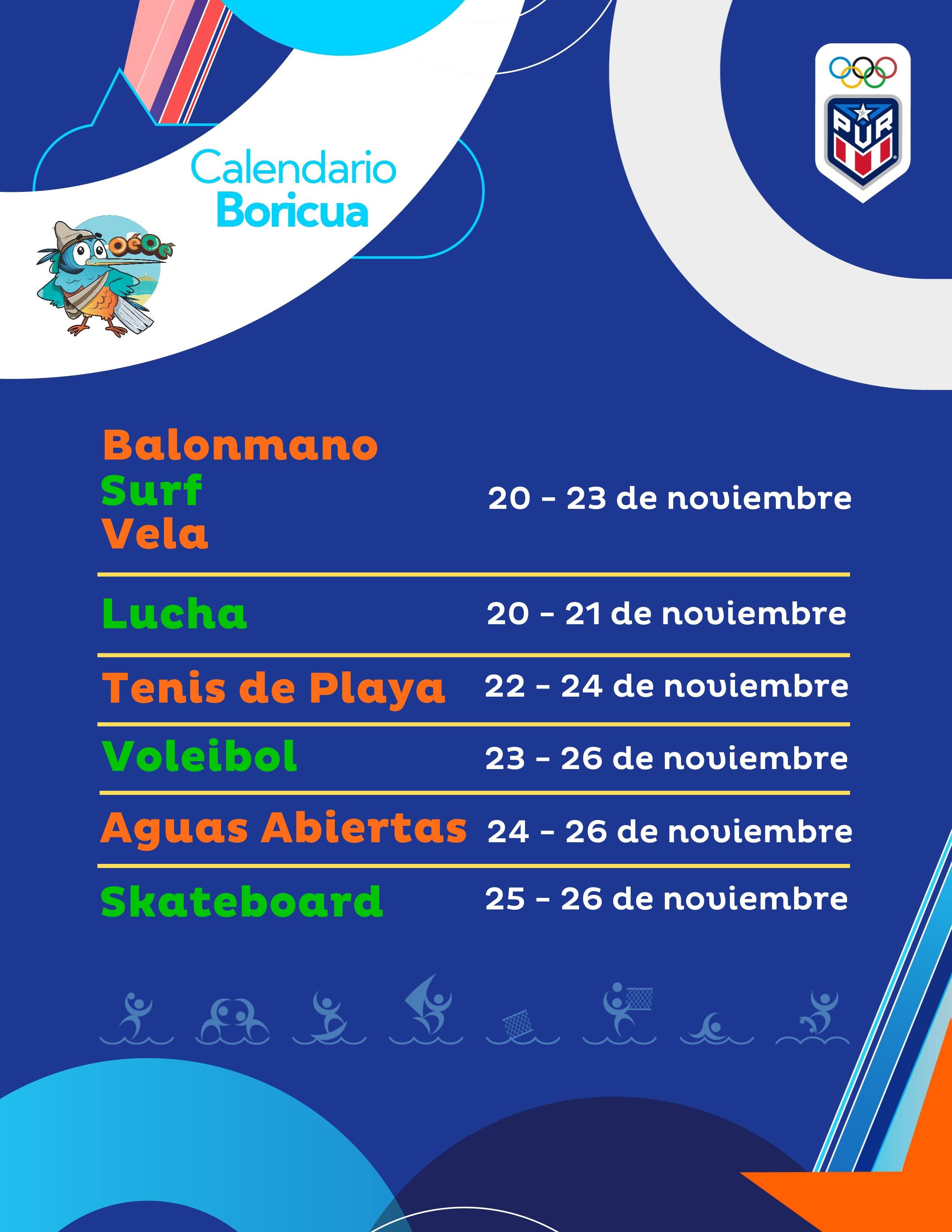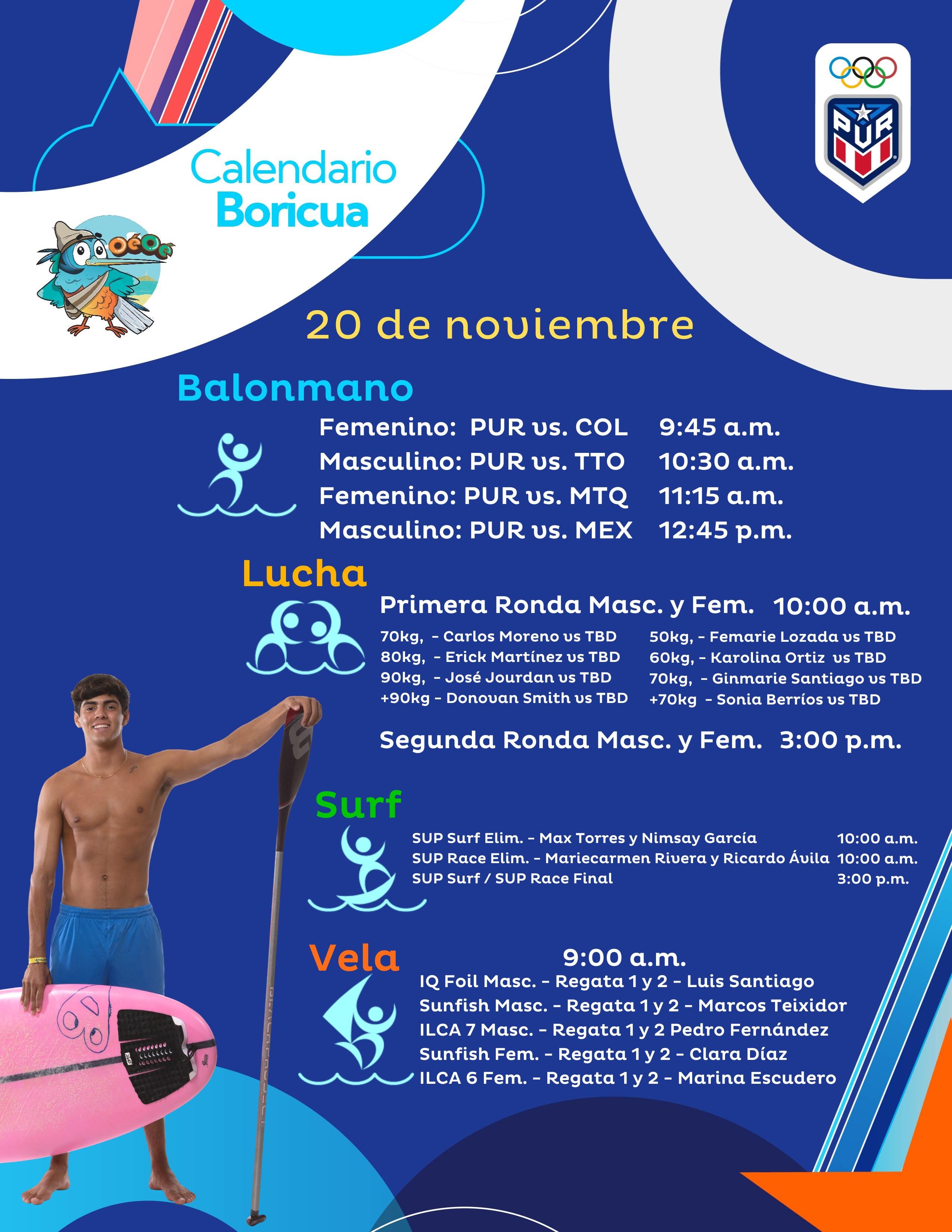 El surf estará en ronda preliminar desde las 10:00 a.m. (PUR). Los primeros competidores serán Max Torres y Nimsay García en SUP Surf, y Mariecarmen Rivera y Ricardo Ávila en SUP Race. La carrera final será a las 3:00 de la tarde (PUR).