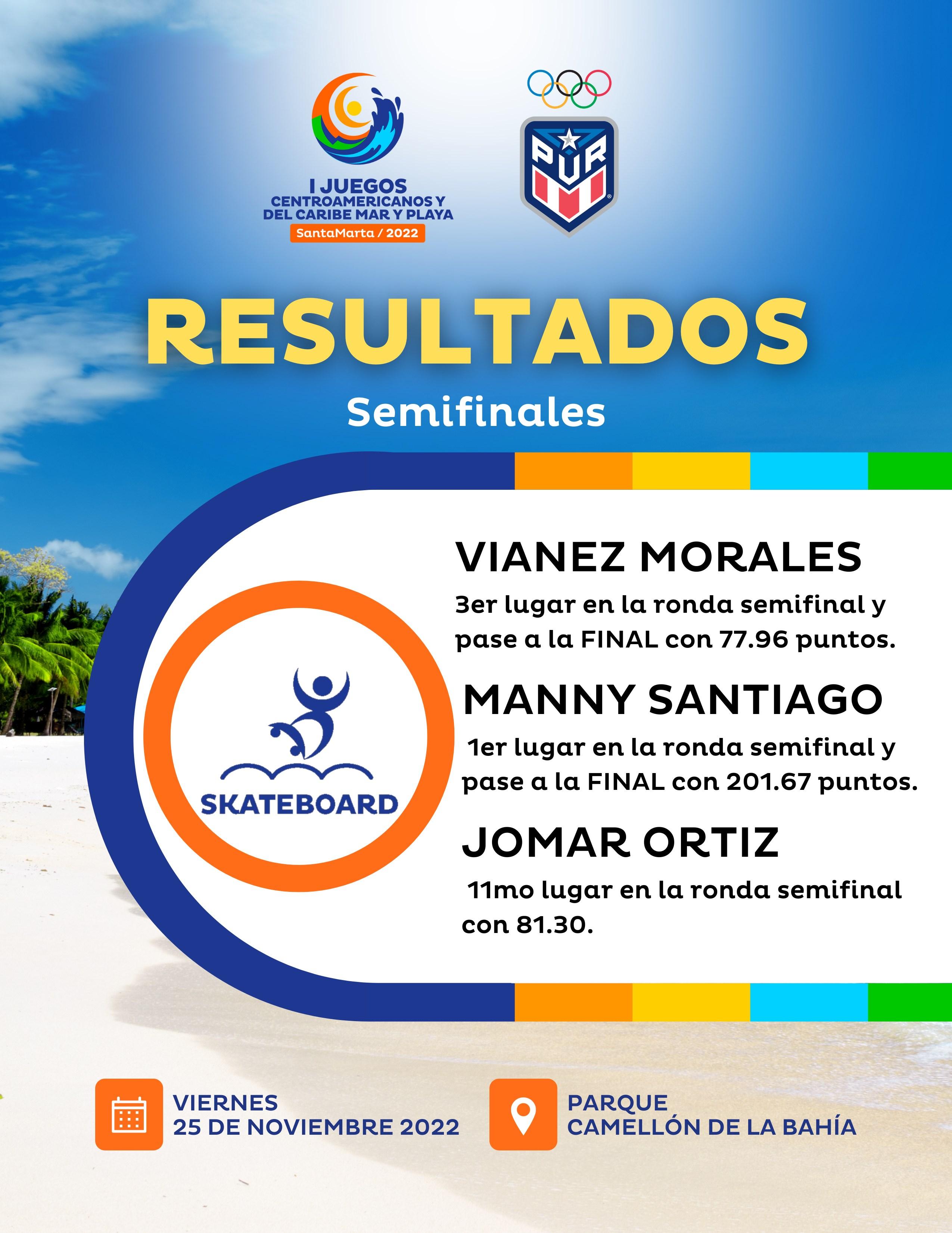 Los patineteros Emanuel “Manny” Santiago y Vianez Morales Collazo clasificaron este viernes a la final de skate modalidad street. Mientras, la dupla femenina de Allanis Navas y María González están listas para completar su participación en el torneo de voleibol de playa, al conseguir su pase a las semifinales con la mira en el campeonato. Ambas disciplinas son parte de los deportes que cerrarán mañana, sábado, los I Juegos Centroamericanos y del Caribe Mar y Playa Santa Marta 2022.