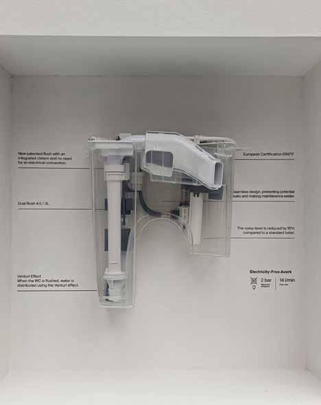 Roca’s Avant redefined bathroom design with a sleek all-in-one solution that integrates the cistern directly into the toilet bowl. By eliminating visible operating plates and incorporating a sealfree design, Avant achieves a clean, modern aesthetic while prioritising practicality. The innovative flushing system, powered by the Venturi effect, is a groundbreaking collaboration between Roca and SIAMP. This patented technology offers greater water control and simplifies maintenance, making it a game-changer for bathroom spaces.