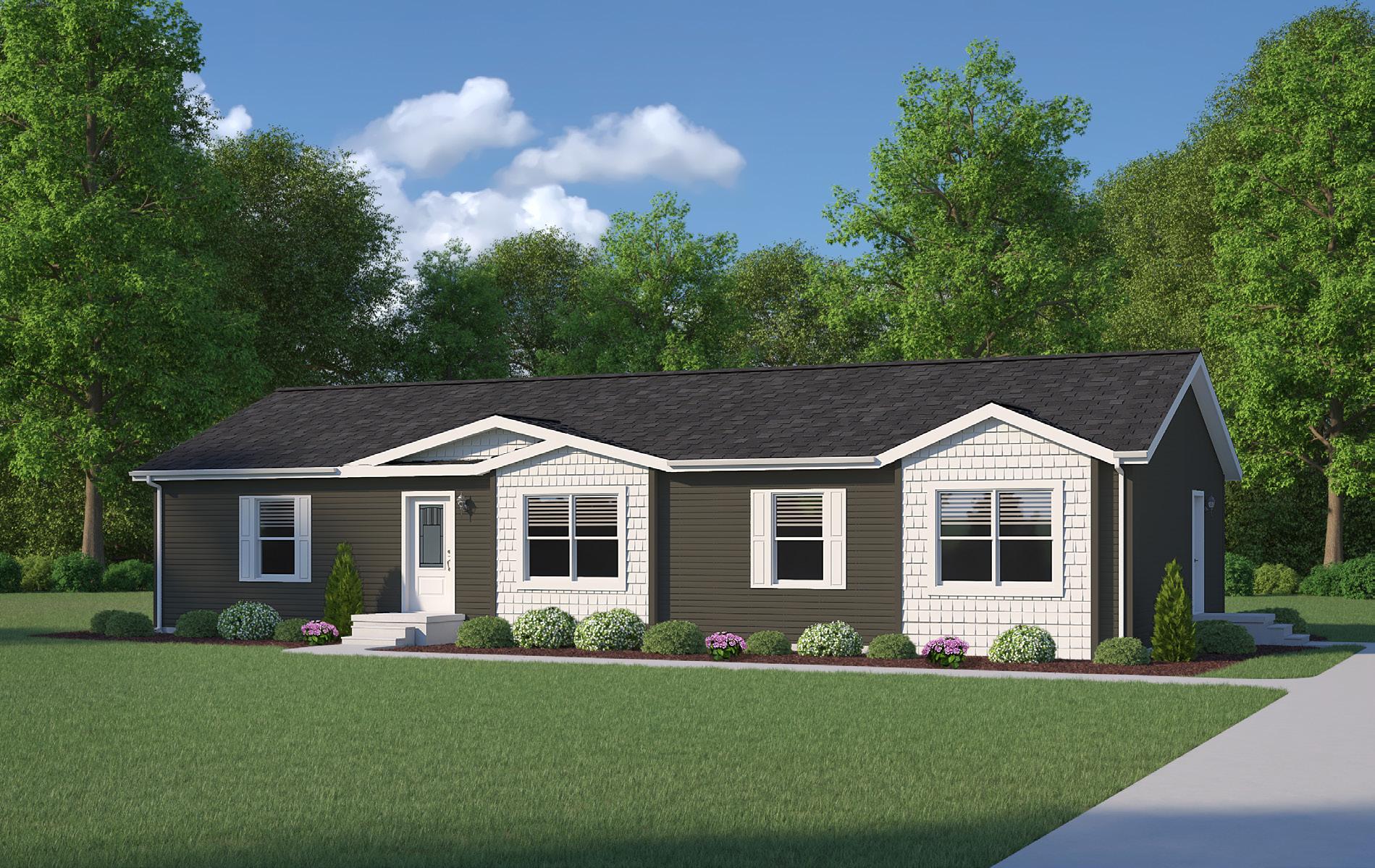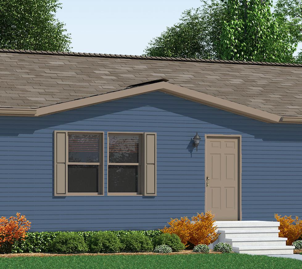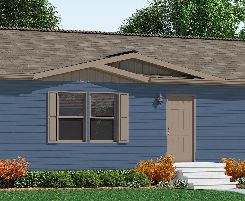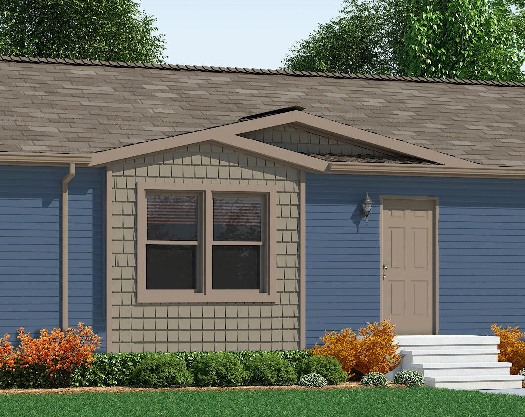 Shown With: Transom Window, Sliding Door, Attached Porch, Shake Accent, Half Lite Door, #61 Box Bay and Lineals