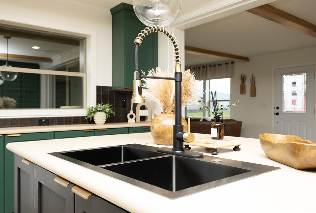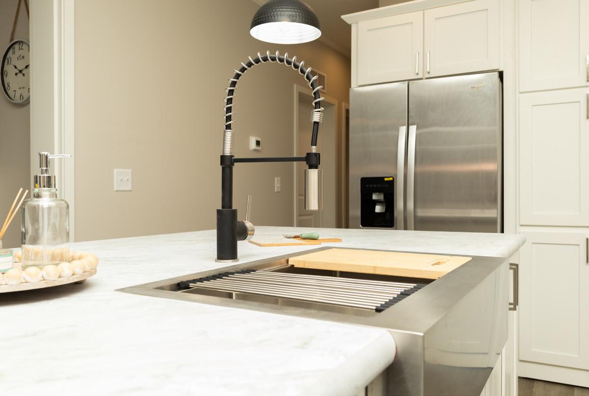 Billard Mission Painted Maple Flat Panel Kitchen Cabinet, Full Tile Backsplash, Gold Industrial Pendant Light, 6-Door Walk-In Pantry, and Coil Spring Faucet.