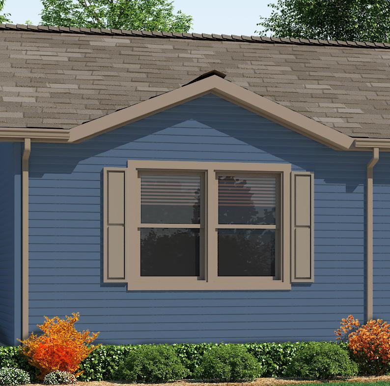 Box Bay with Twin Peak Dormer, Box Bay 10’ Flush Dormer, Shake Accent, Lineals and Shutters