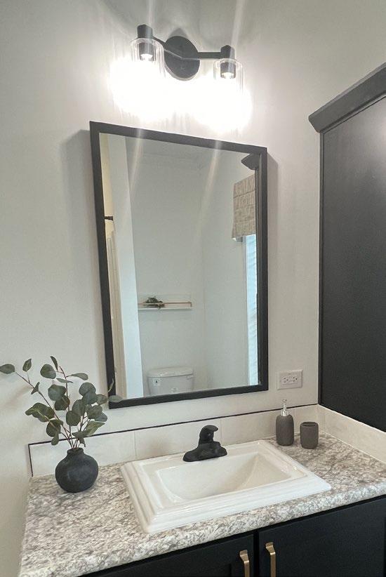 Black Single Lever Faucets Throughout with Matte Black 2-Light Vanity Lights & Black Wood Framed Mirrors