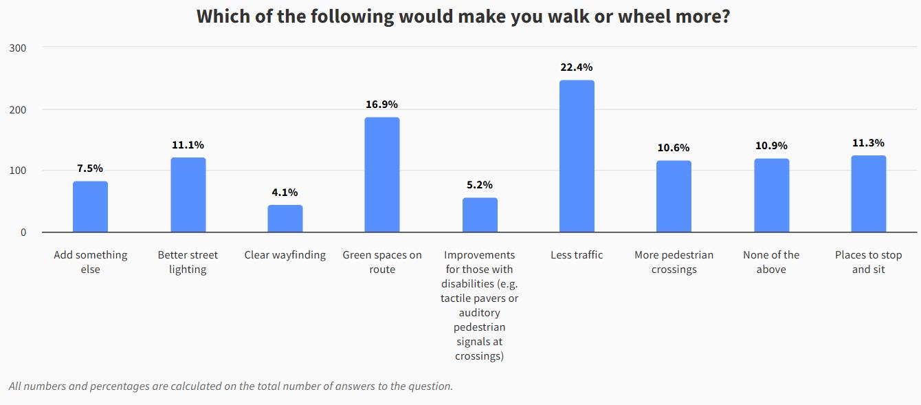 Out of the total of 567 responses received for this question, 57 (around 10%) respondents expressed that “Improvements for those with disabilities (e.g. tactile pavers or auditory pedestrian signals at crossing)” would make them walk or wheel more in the borough.