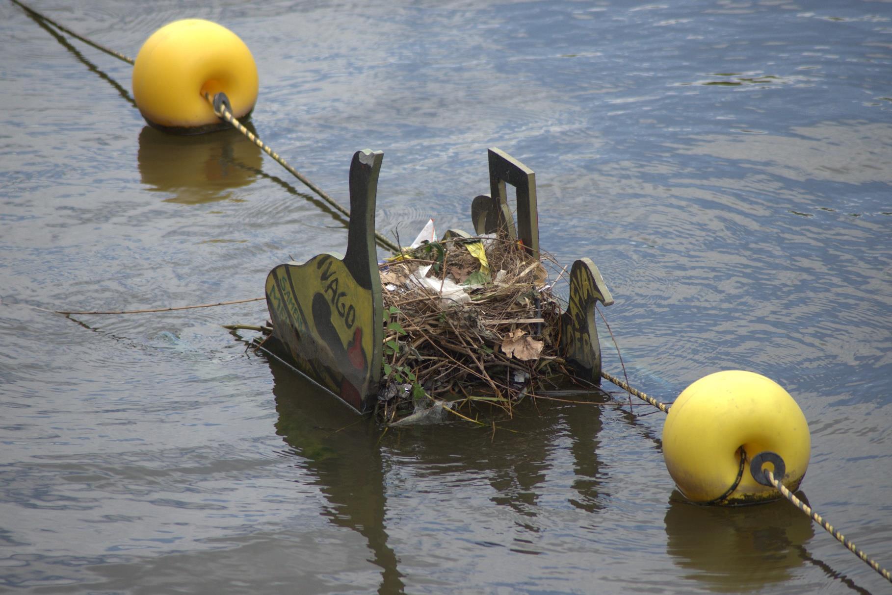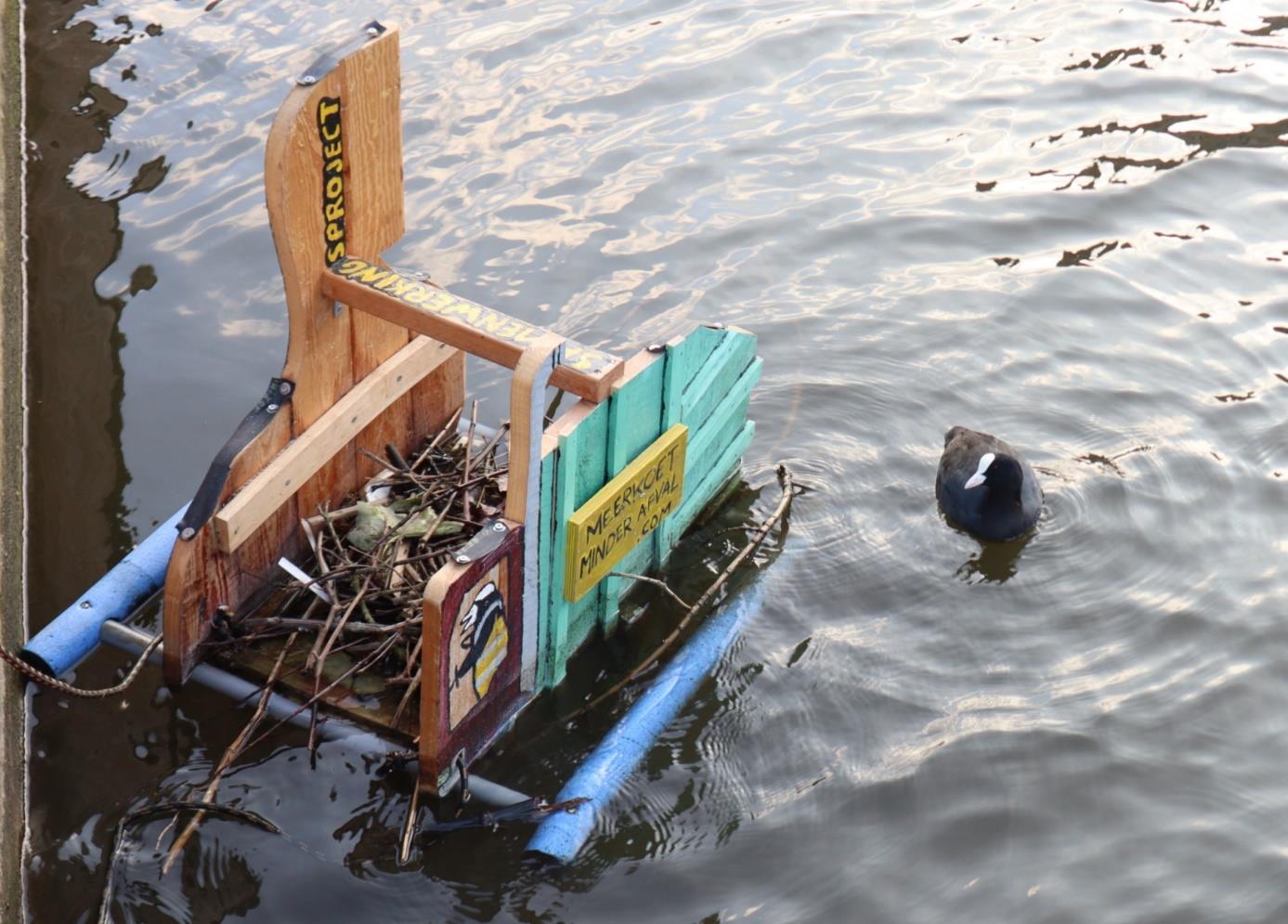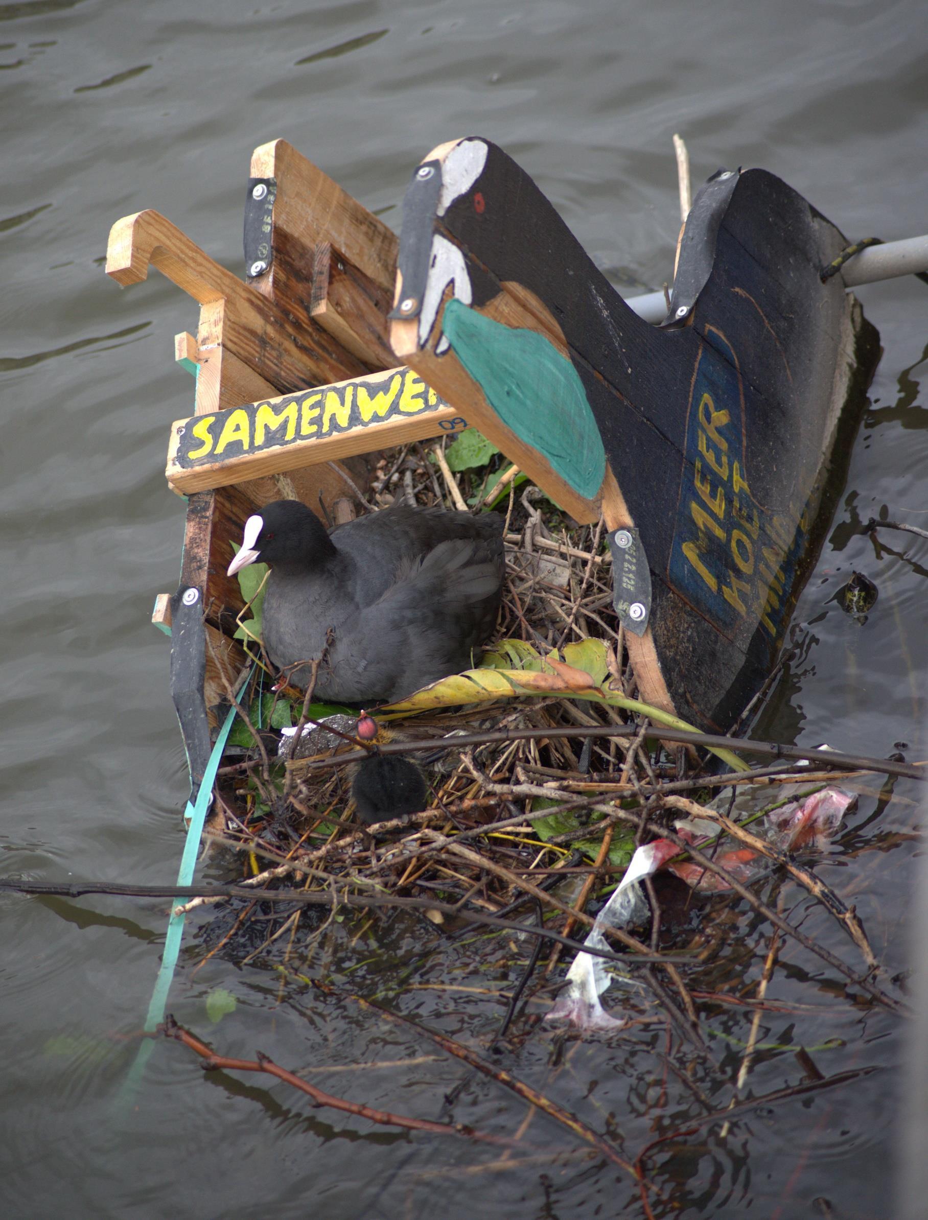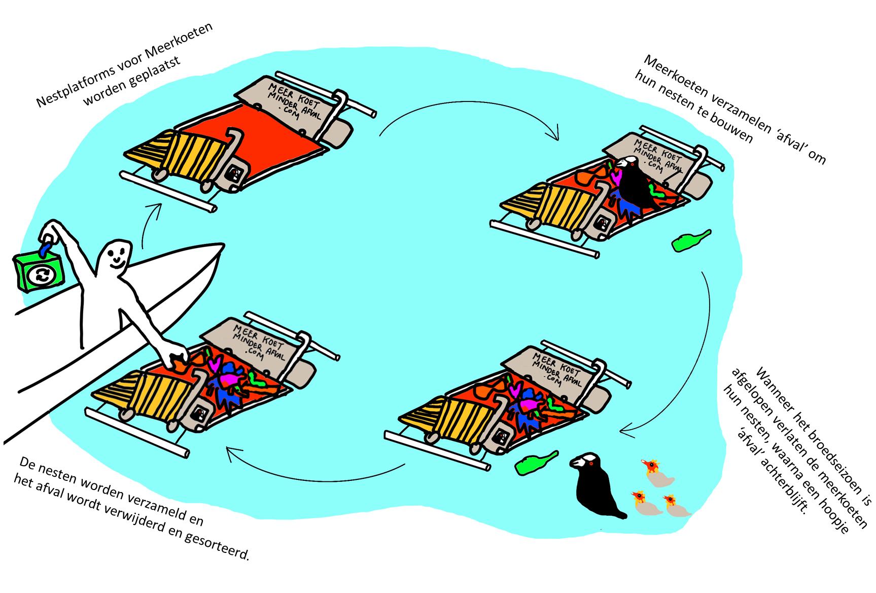 Speciaal ontworpen nestplatforms werden geplaatst in stedelijke wateren. Meerkoeten verzamelen vervolgens afvalmaterialen om hun nesten op deze platforms te bouwen. Na het broedseizoen worden de nesten zorgvuldig verwijderd, zoals ze in de natuur ook elk jaar zouden wegspoelen, waarna het ingezamelde ‘afvalnest’ wordt gesorteerd en gerecycleerd. Op deze manier worden meerkoeten actieve deelnemers aan stedelijk afvalbeheer.