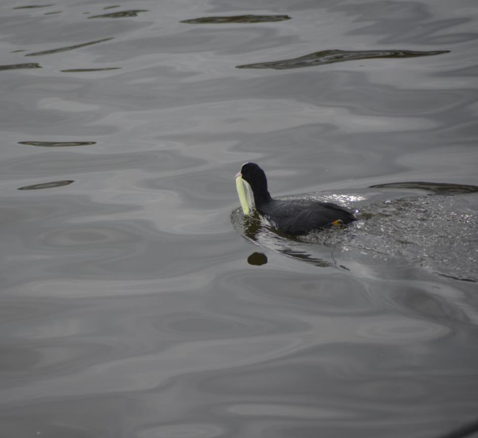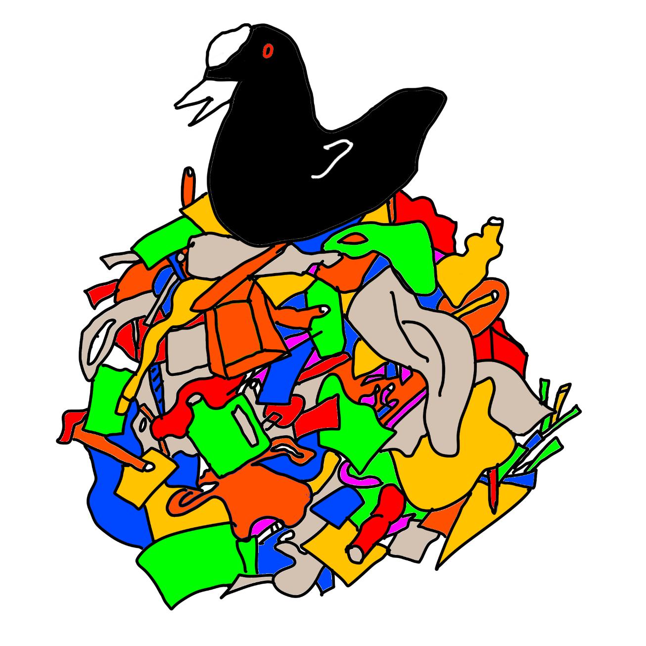Meerkoeten verzamelen onder andere afval om hun nest te bouwen.