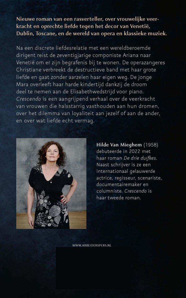 De schrijfster is ons bekend als actrice, scenariste en regisseur waar ze haar plaats naast de beste veroverd heeft. In haar boeken bewijst ze eveneens talentvol te zijn in de vertelkunst. Het gaat over de veerkracht van vrouwen die vasthouden aan hun dromen. In Crescendo wordt de muziek en de liefde bepalend in het leven van drie bijzondere vrouwen.