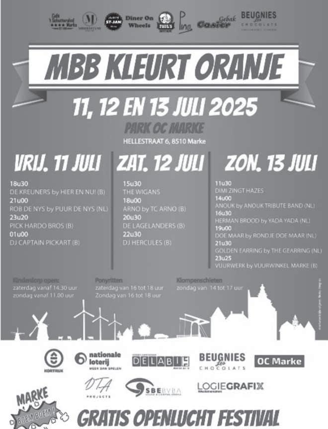 een warme oproep naar alle bezoekers! kom op zondag 13 juli naar het festival MBB kleurt oranje in een oranje outfit. Gekke oranje pruiken, kleren en natuurlijk de polonaise mogen niet ontbreken op deze Nederlandse dag!! alle informatie op: www.markeboemboem.be