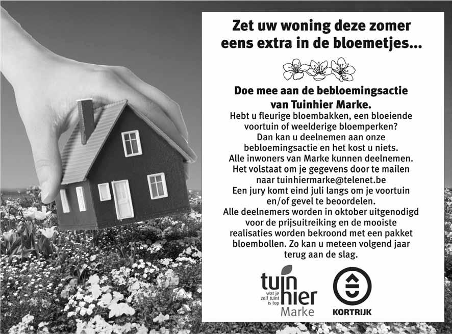 Teksten, annonces en advertenties verwachten wij voor de 1° van de maand voorafgaand aan de maand van gewenste publicatie. Onze brievenbus: OC Marke, Hellestraat 6 te 8510 Marke (tel. 056 240 820) per mail: oc.marke@kortrijk.be. Let wel: wie te laat is, is te laat ! Dorpskrant Marke wordt gratis verspreid in Marke en kan digitaal gelezen worden op: www.kortrijk.be/Marke, onder de rubriek Dorpskrant.