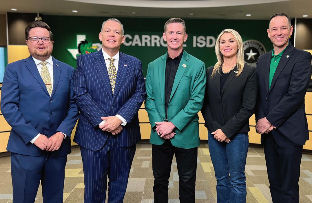 Representatives from HPU and Carroll ISD joined together to sign the Gold and Blue Partnership agreement. Pictured are (left to right) Dr. Ben Martin ’04, associate vice president for enrollment management at HPU; Dr. Cory Hines ’97, HPU president; Cameron Bryan, CISD trustee; Renee Bottom, CISD trustee; and Dr. Jeremy Glenn, CISD superintendent.