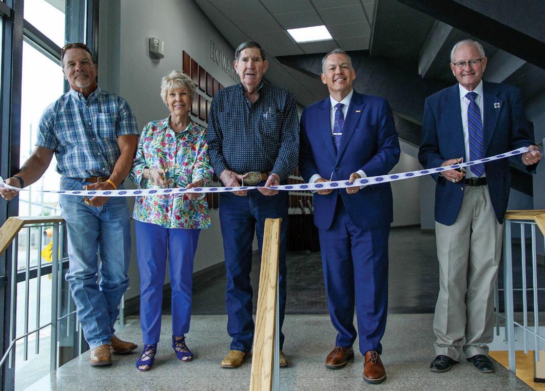 A ribbon cutting was held for the new HPU Athletics Hall of Fame at the Brownwood Coliseum on May 17. Pictured (left to right) are Gregg Fisher; Vicky Fisher; Dale Fisher ’61, Hall of Fame member; Dr. Cory Hines ’97, university president; and James Williamson ’70, Hall of Fame member.