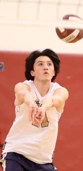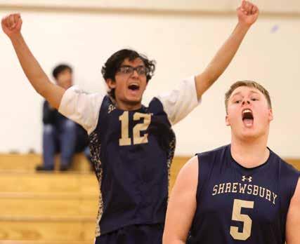 The first point of the match — and in Shrewsbury boys’ volleyball history — went to the Colonials, with Brayden Crandall blocking a shot at the net. The program won its firstever set (25-21) and cruised to a second-set victory (25-10).