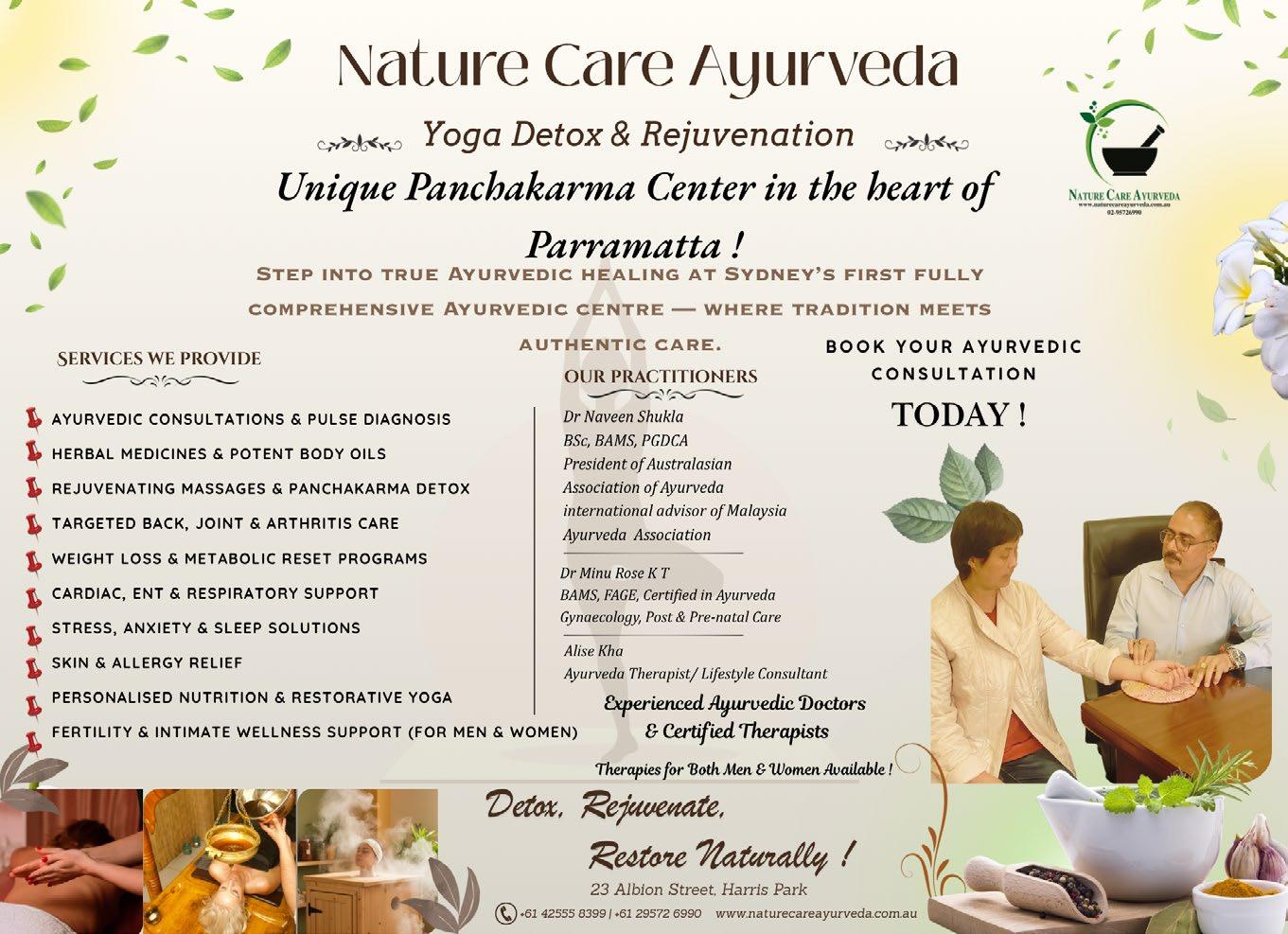 LOCATED in Harris Park, Sydney, Nature Care Ayurveda offers a comprehensive approach to wellness rooted in the ancient Indian system of Ayurveda — the “science of life.” The centre combines time-tested therapies, personalised consultations, and holistic detoxification programs designed to restore balance to the body, mind, and spirit.