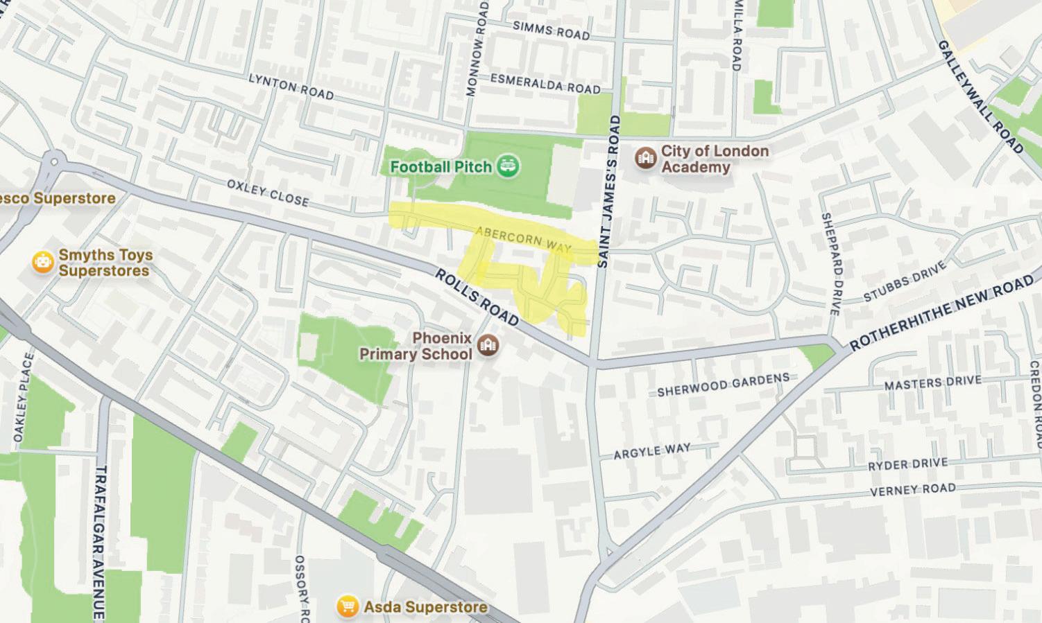 The 186 homes on Achilles Close, Abercorn Way and Acanthus Drive, are just off Rolls Road in South Bermondsey.