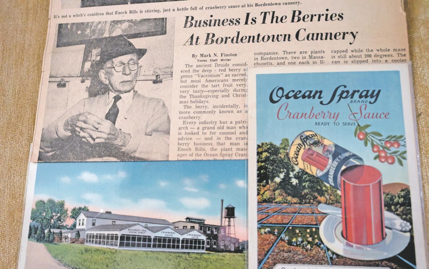 And the Bordentown Historical Society is fortunate to have several artifacts associated with the now-closed Ocean Spray Cranberries, Inc. facility in Bordentown including vintage postcards, “an honorary” wooden cranberry scoop, framed aerial photographs of the plant, and an empty Ocean Spray cranberry sauce container.