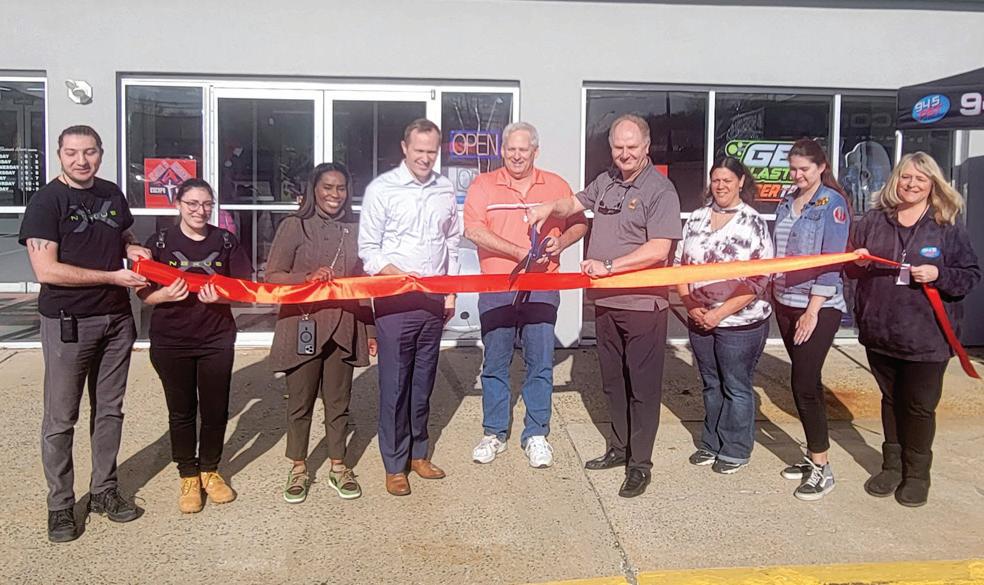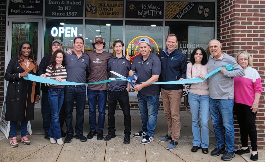 Bagel Bazaar owners Dave Salva, Paul Salas and Randy Peltz, with Hamilton Mayor Jeff Martin and staff, cut the ribbon on their new Mercerville franchise on Nov. 10, 2025. (Staff photo.)